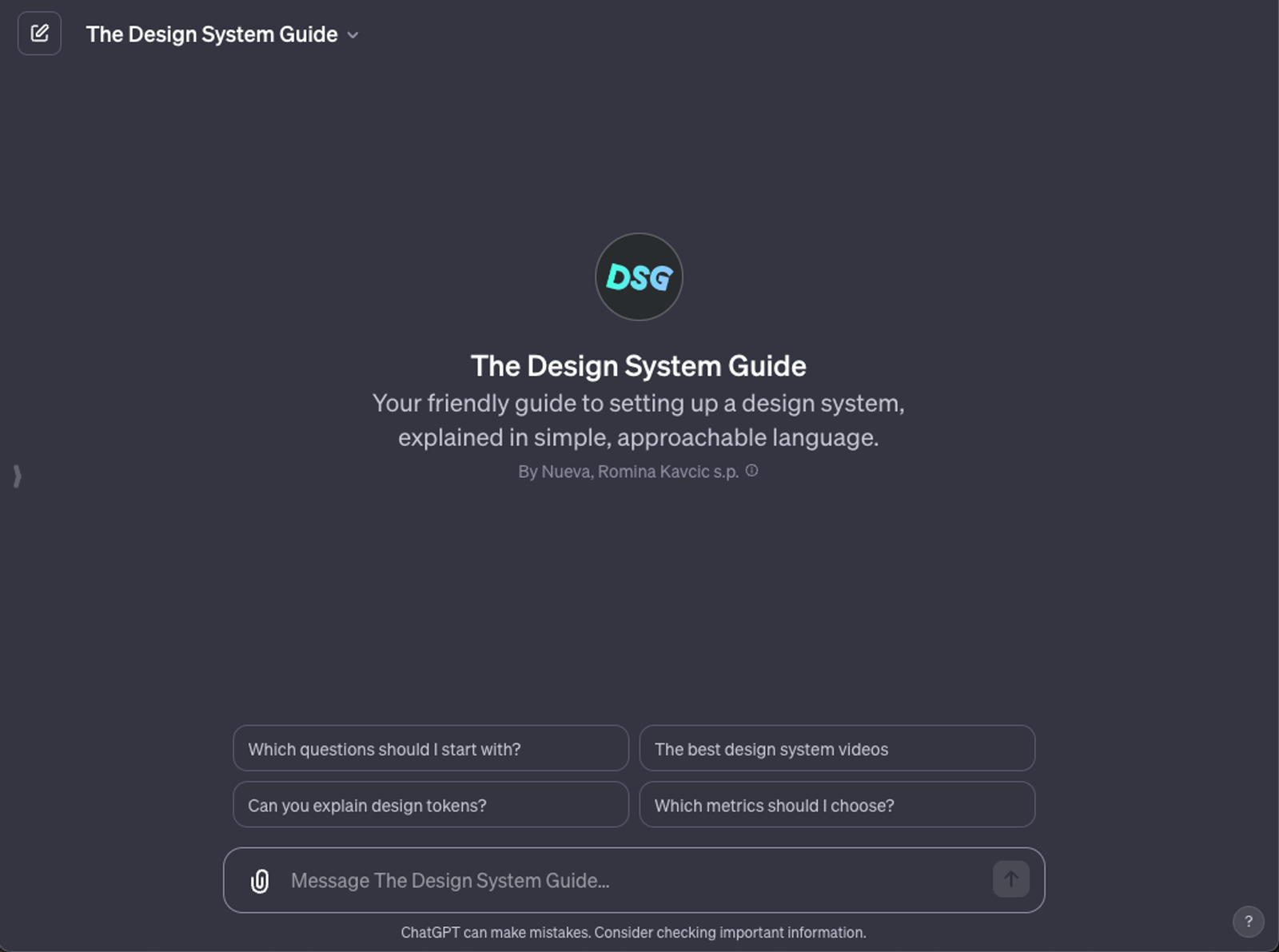 The Design System Guide - Romina Kavcic created this helpful GPT that can answer questions about creating and maintaining design systems.
