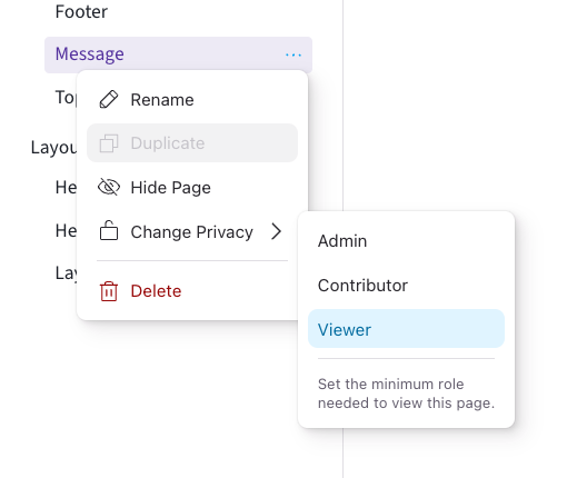 Control which users can access specific pages and sections based on their assigned role in Knapsack with the new access control features in v4. Administrators can set the minimum role required to access any page or section directly within the menu controls when editing a branch. Unlike hidden pages, which are accessible to all users but do not appear in the navigation, private pages appear in the navigation but are locked for users that do not have the required role necessary to access them.