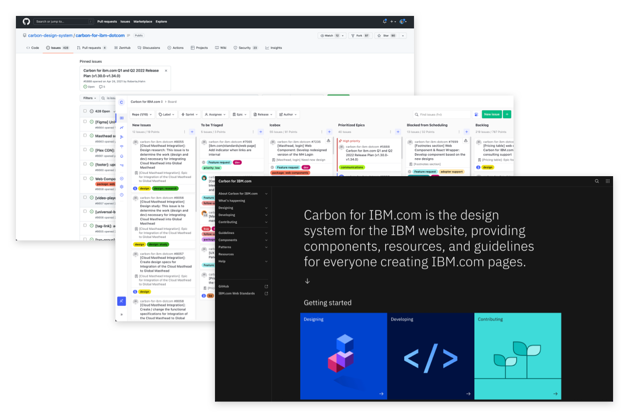 The Carbon for IBM.com leadership team meets twice a week to triage new issues in GitHub. We use a collaboration method internally referred to as the “four-in-the-box” model, where design lead, development lead, product owner, and project manager get together, and align on decisions, next steps, scheduling, and move the issues down the pipeline. This method helps us closely monitor and respond to the touch points with the adopters, so that the surface experience is an efficient and reliable one. To keep these meetings efficient, fire-line designers and developers fill in any “blanks” that may have come up during triage.