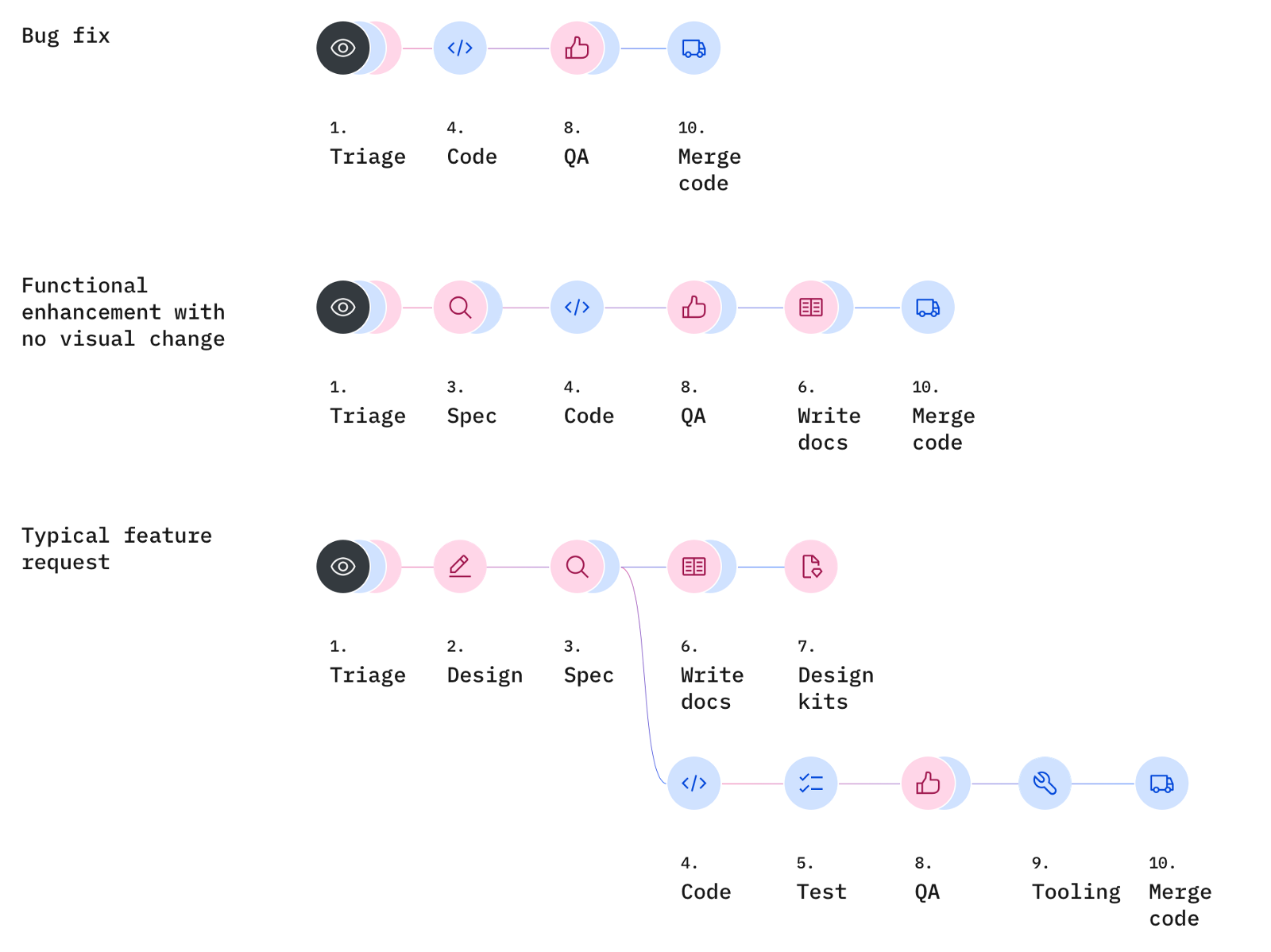 Below is a high-level overview of our workflow. Steps colored magenta are work primarily handled by designers; blue steps are handled by developers, and black-colored steps are handled by the leadership team. (You can find detailed step descriptions in the Appendix.)