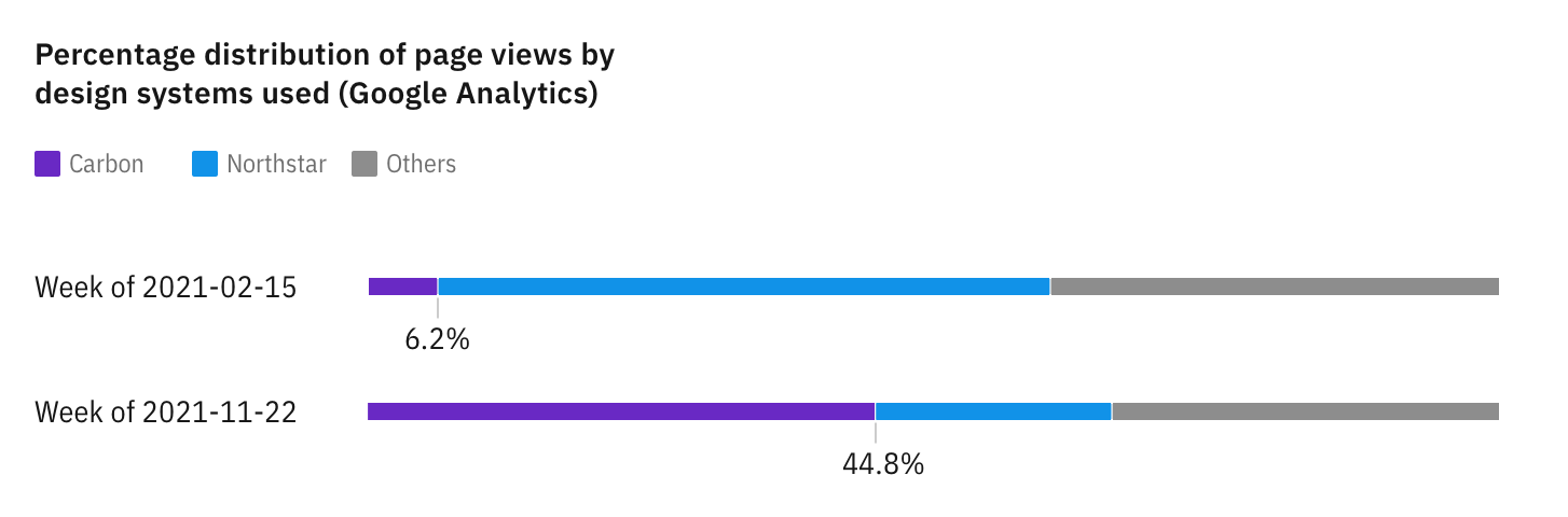 We started the year with 6.2% of all pageviews attributed to pages built with Carbon. By the end of November that same year, 44.8% of page views of all pages on IBM.com were attributed to us. Meanwhile, the page views attributed to the deprecated design system Northstar has been steadily reducing from 54% to 21%, suggesting the increase in page views we got is not just from new pages, but also because page owners are successfully migrating their pages over.