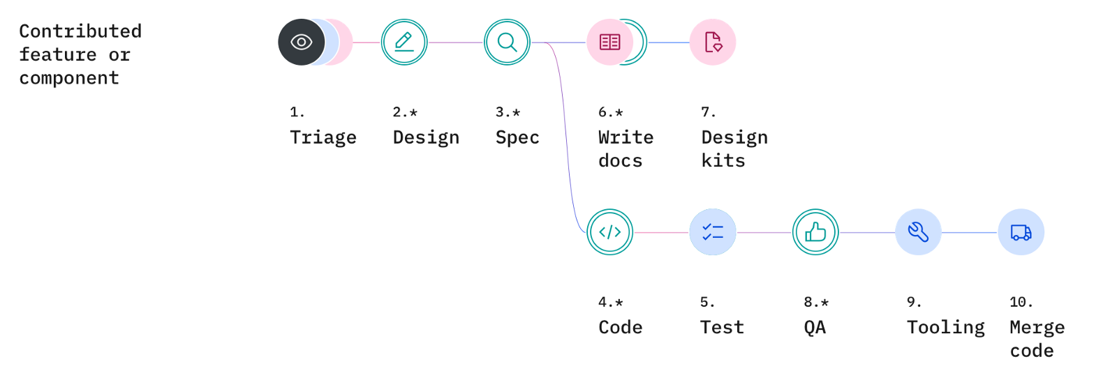 Below is a high-level overview of our workflow. Steps colored magenta are work primarily handled by designers; blue steps are handled by developers, and black-colored steps are handled by the leadership team. (You can find detailed step descriptions in the Appendix.)