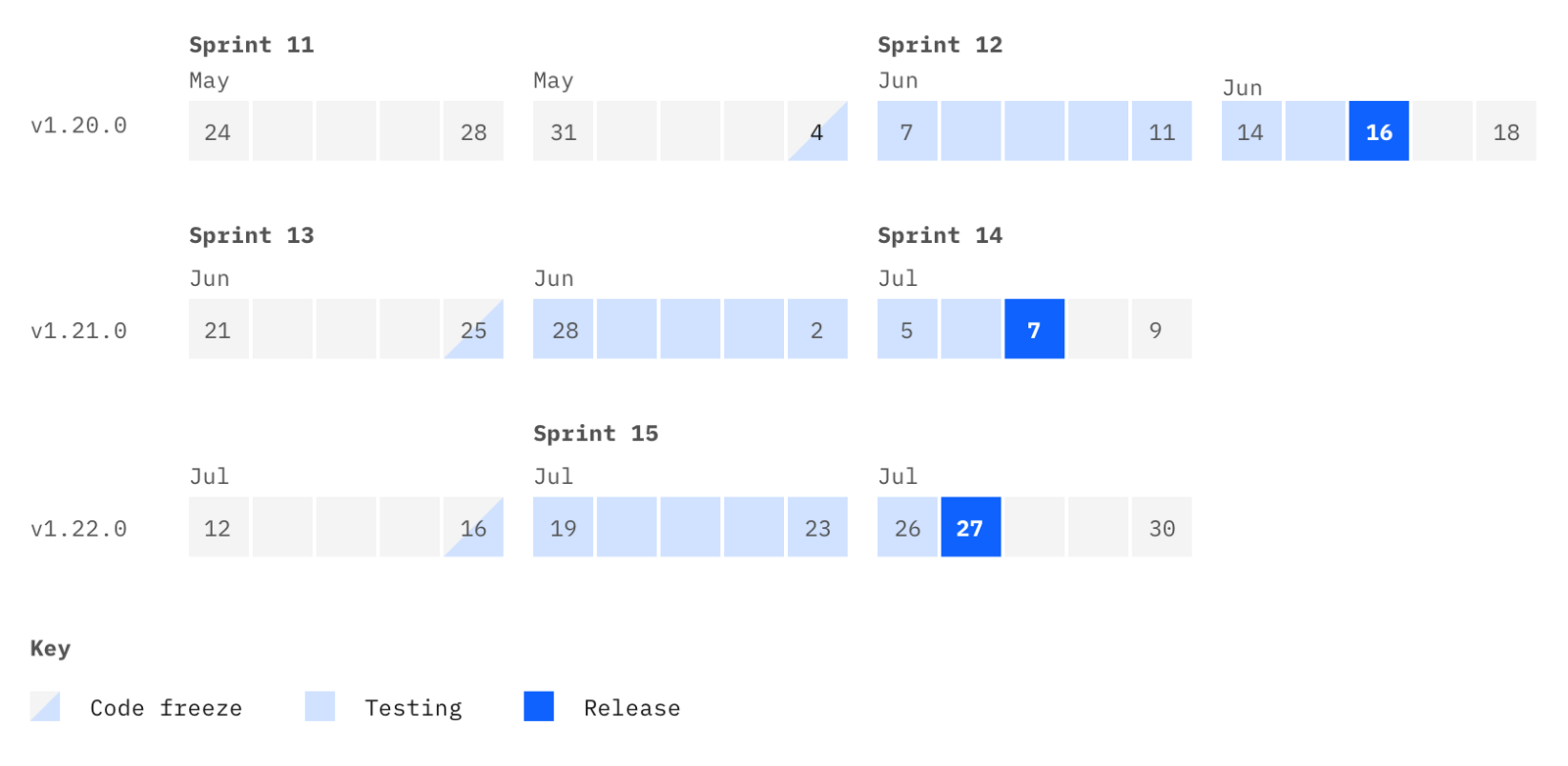 We practice the standard two-week sprint. Below is the calendar for our version 1.20 to 1.22 releases. We quickened the release pace by one week so our adopters can get the changes faster.